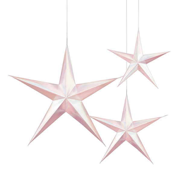 Hanging 3D Star Decorations Iridescent White & Pink 3pk | Online Party Store | Iridescent Coloured Decorations