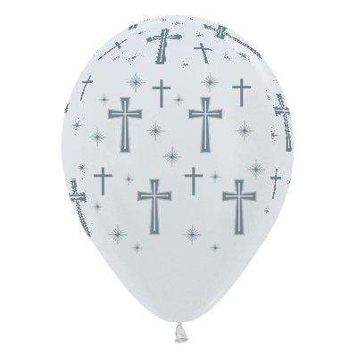 Sempertex 30cm Holy Cross Satin Pearl White & Silver Ink Latex Balloons, 25PK, Latex Balloon. 90% biodegradable within 2 years., 30cm when inflated, 25 Pack