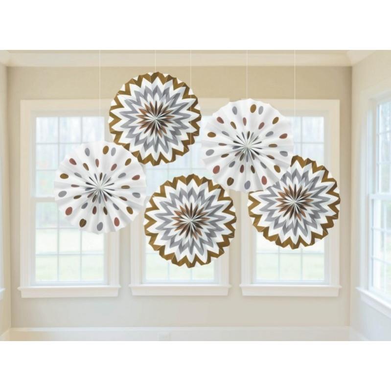 Mixed Metallic Fan Decorations Printed Paper 8in 5pk | Online Party Store | Gold Coloured Decorations