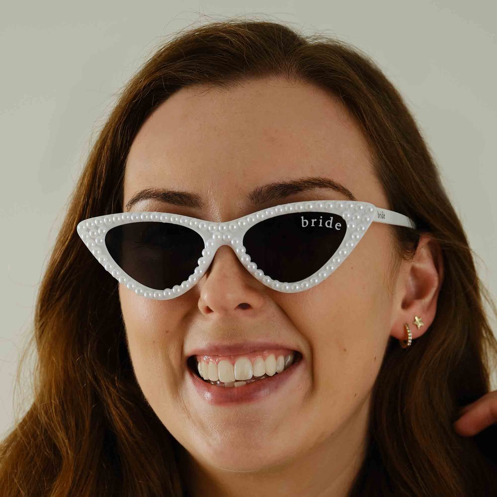 She's Tying the Knot Bride SunglassesEach Pack Contains: 1 x ivory 'bride' cat eye shaped novelty glasses with pearl details