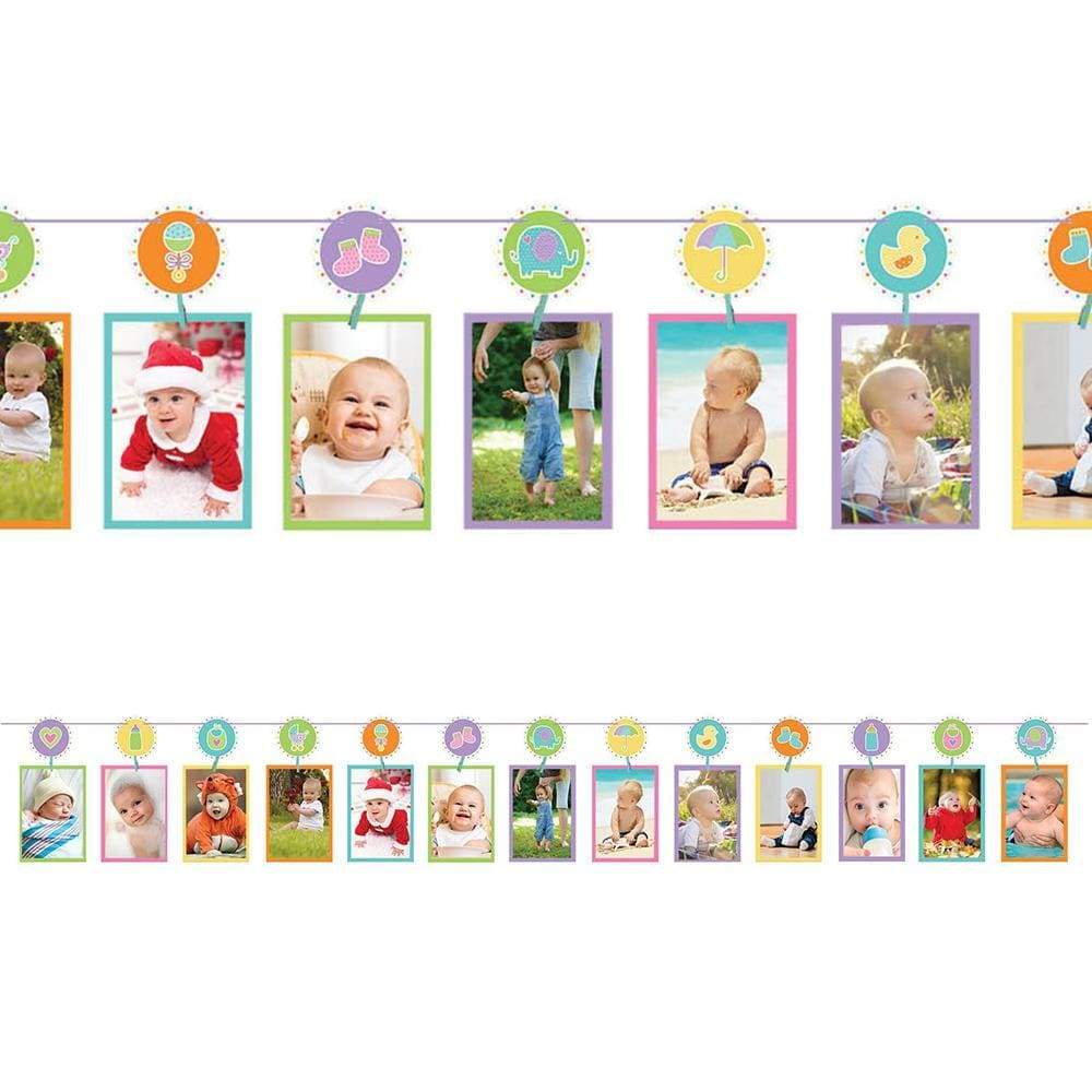 - 13 x Scallop-edged baby-themed cutouts with blue pegs attached - measures 7.5cm in diameter