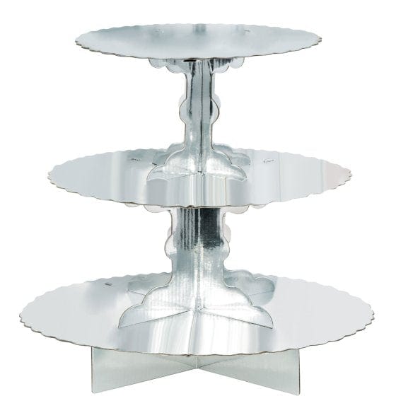 Cupcake 3 Tier Treat Stand Silver, 28cm x 24cm, Cardboard. Simple assembly required, includes instructions, 1 stand per package