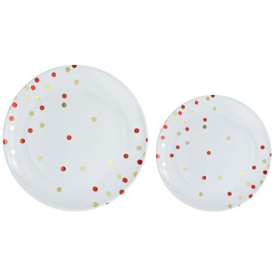 Premium Plastic Plates Hot Stamped with Apple Red Dots, Boxed multipack 10 x 26cm & 10 x 19cm., Hand wash only, 20 per pack