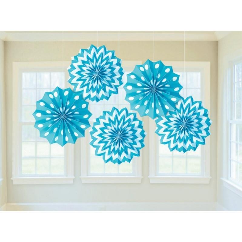 Caribbean Blue Fan Decorations Printed Paper 8in 5pk | Online Party Store | Caribbean Blue Coloured Decorations