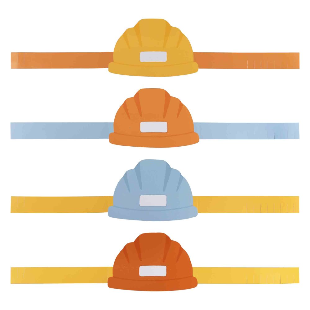 • 5 x customisable card construction party hats in yellow, orange and blue with adjustable straps.