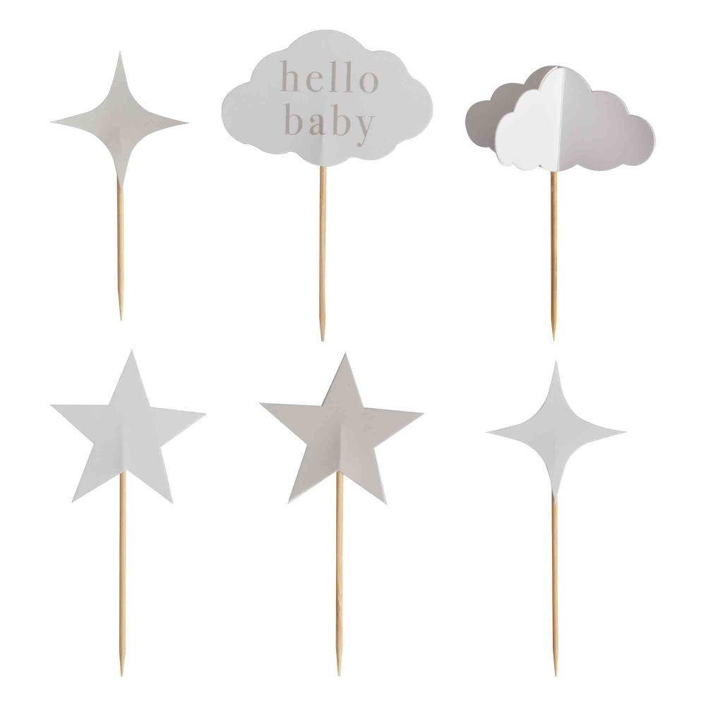 Dream Baby Cupcake Toppers 12pkEach pack contains:12 x white and grey paper cupcake toppers including 3D clouds, 'Hello Baby' clouds and stars