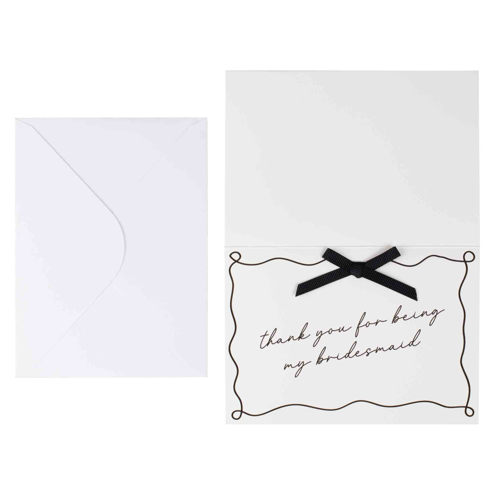 Each Pack Contains:- 4 x black and cream 'thank you for being my bridesmaid' cards at 10cm H x 14.8cm W with black grosgrain bows and white envelopes