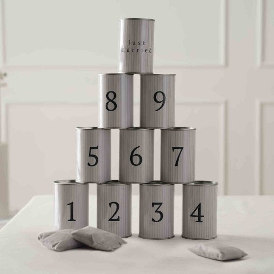 Midsummer Mr & Mrs GameEach Pack Contains: 1 x wedding tin can alley game with 10 x grey and white striped tin cans each at 10cm H x 6.5cm W and 3 x grey bean bags