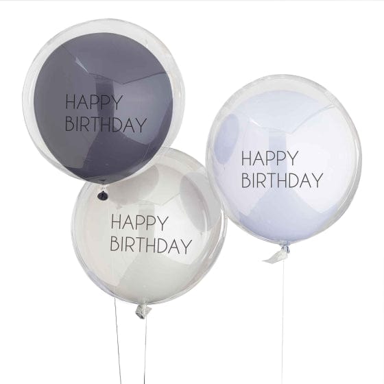 Celebrate your birthday with our blue and grey double layered Happy Birthday balloon bundle. This stylish balloon cluster contains 3 balloons.